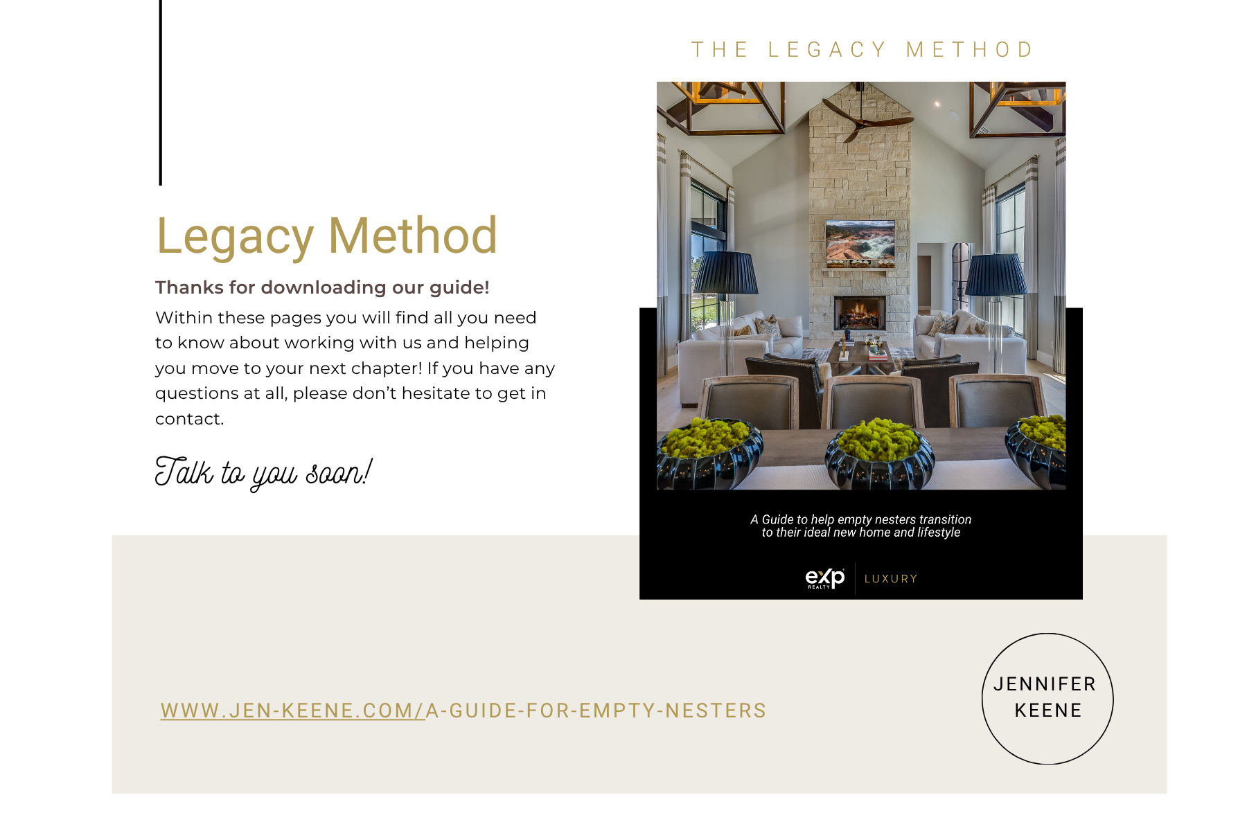 Are you an empty nester looking to embark on an exciting new chapter, but feeling overwhelmed by the thought of downsizing and moving from your family home? "The Legacy Method: A Guide to Help Empty Nesters Transition to Their Ideal New Home and Lifestyle" is designed specifically for you. This comprehensive guide, created by a realtor specializing in helping downsizers, offers a stress-free, 5-step process to navigate this significant life change with confidence and ease. Discover how to clarify your vision for a new home, prepare your current residence for sale, and find the perfect space that truly fits your evolving lifestyle.